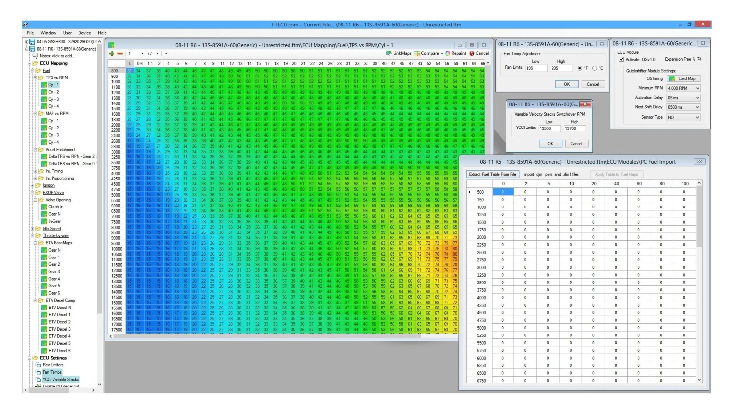 The Flash Tune Bench ECU kit combined with FlashTune’s Software not only allows control of fuel maps, but also functions such as rev-limiter, top speed limiter, O2 sensor on/off, AIS valve and fan on/off temp. Another great feature that is not found anywhere else on the market is the ability to edit the deceleration map. Most if not all stock maps cut all fuel when the throttle is closed, by adding small amounts of fuel during deceleration it smooths out weight transfer and keeps the chassis settled, resulting in a faster lap time.