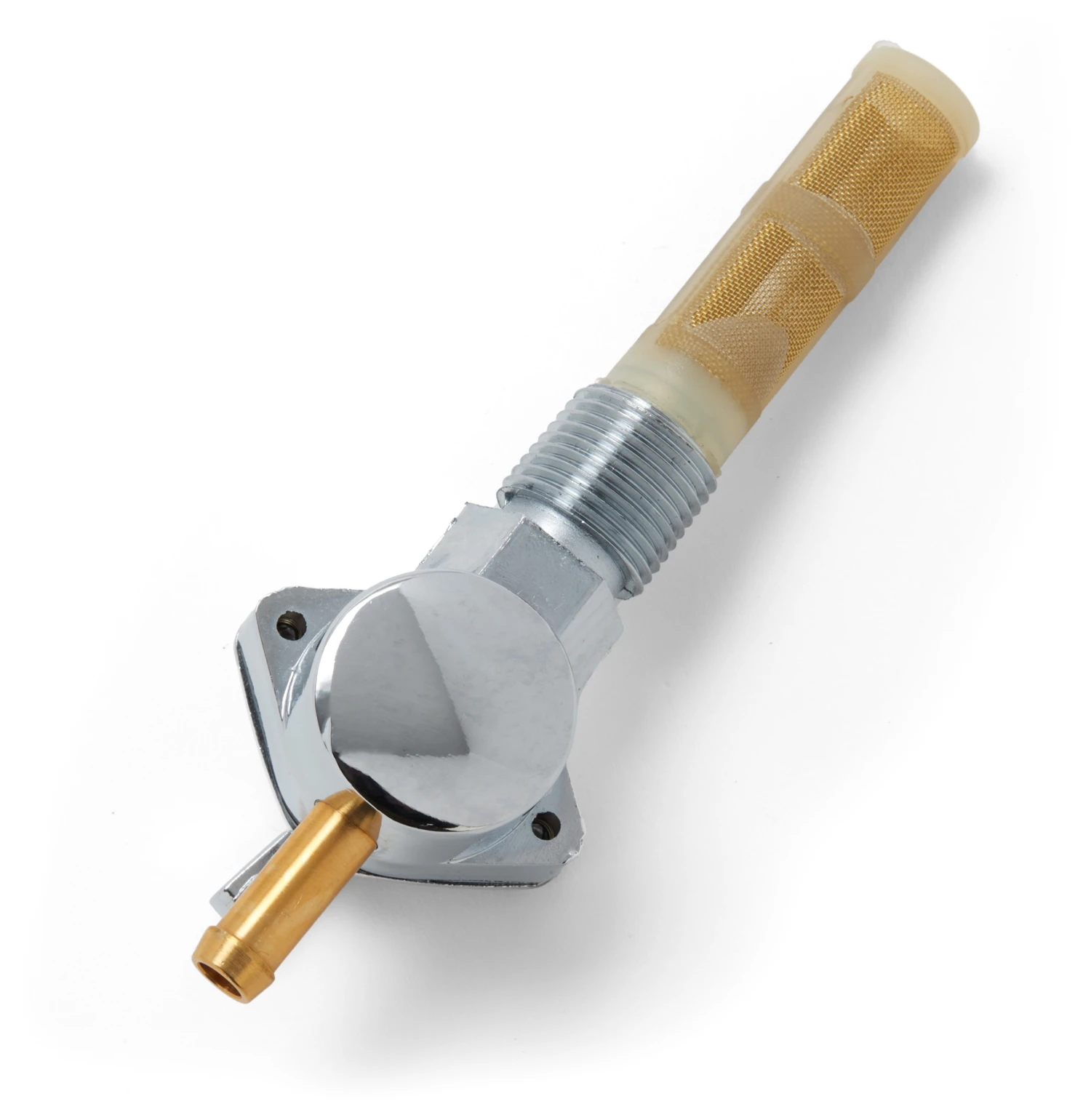 This Milwaukee Twins Chrome Petcock has a 1/4″ vertical outlet. This petcock does not use internal O-rings. Accepts 1/4″ fuel line and features on, off, and reserve functions.